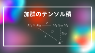$R$-加群のテンソル積を定義するために、まずは$R$-双線形写像を定義する。定義1: $R$-双線形写像そうせんけいしゃぞう$R$を可換環、$M_1,\, M_2$を$R$-加群とするとき、$M_1 \times M_2$を定義域とする写...